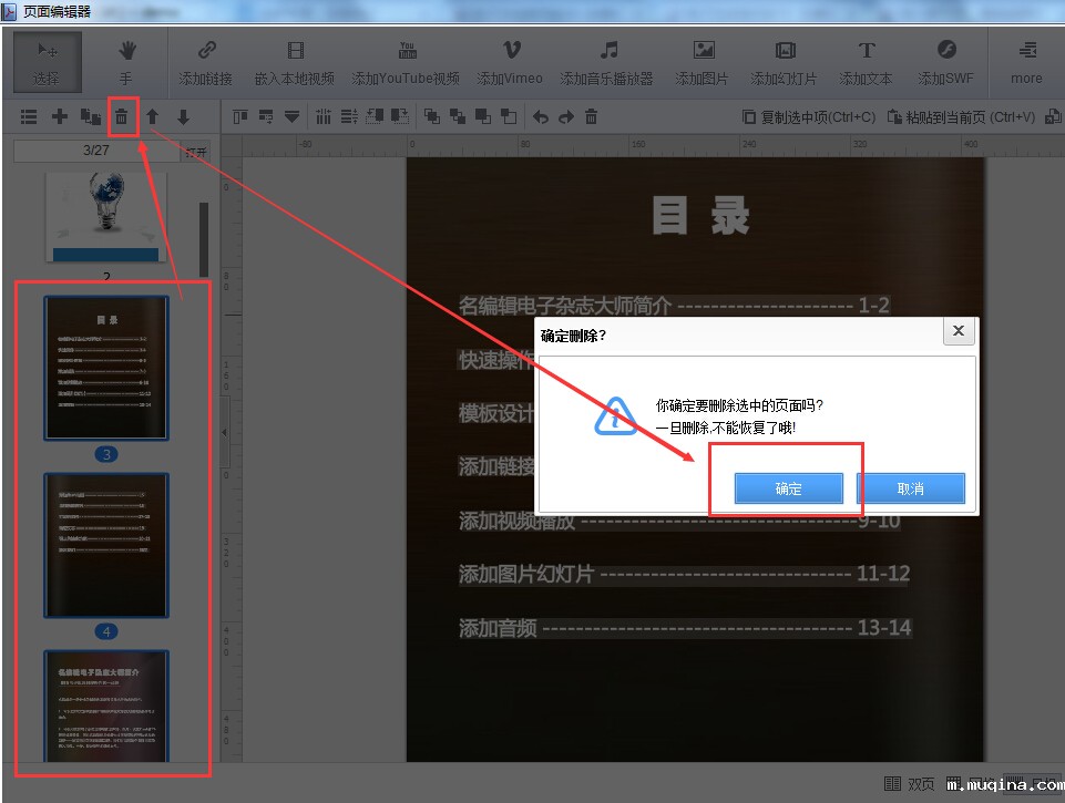 然后点击“删除选择键”,确定下,就可以把示例页面全部删掉,留下我们自己刚编辑排版好的页面了。